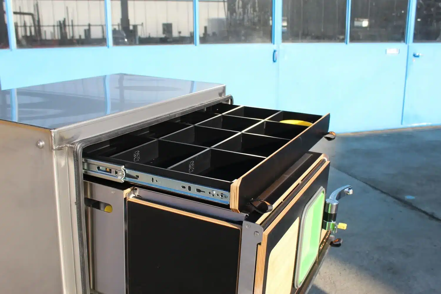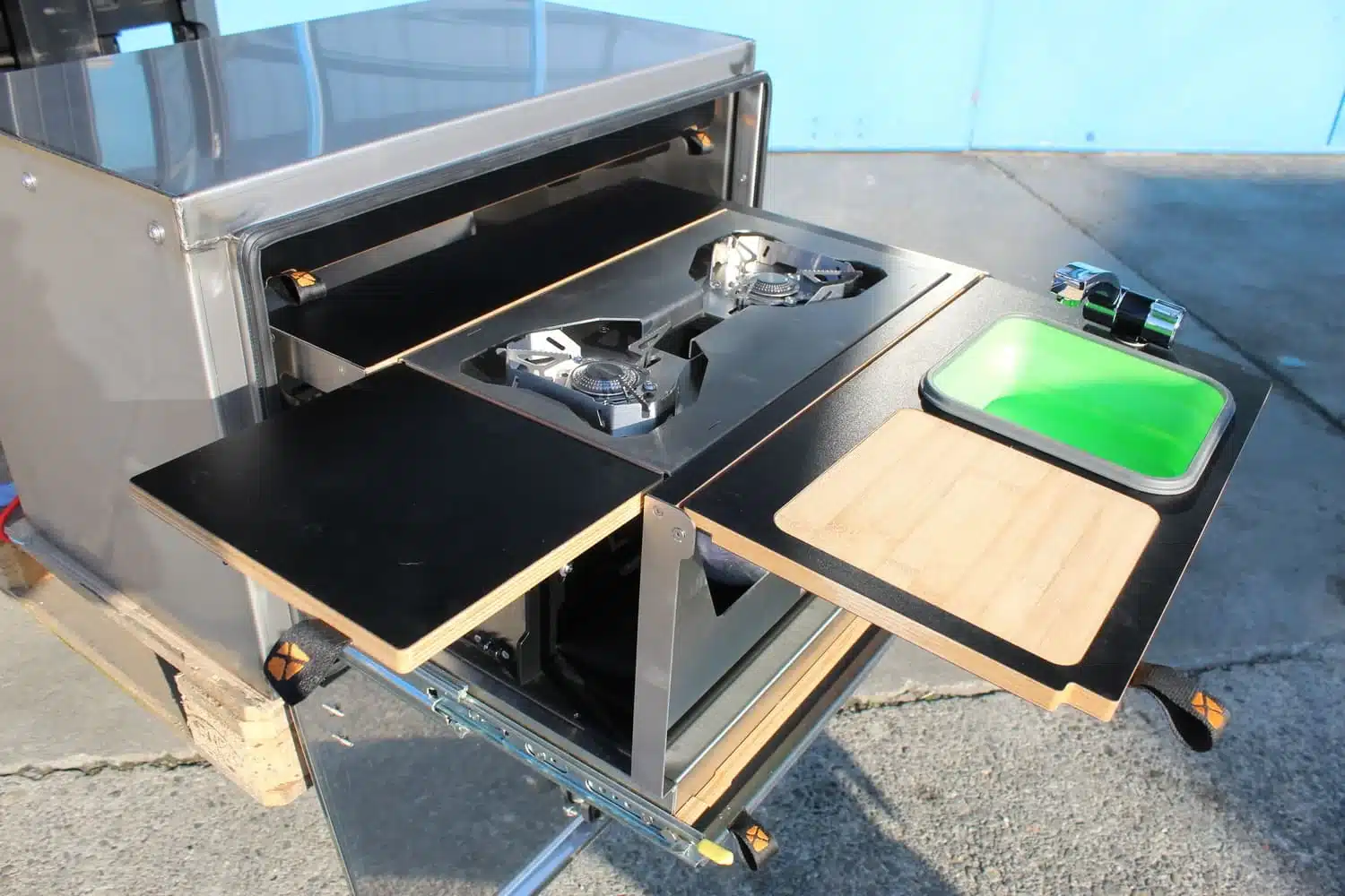 Die Box kombiniert Kocher, Arbeitsfläche, Spüle und Stauraum in einem stabilen Auszugssystem. So lässt sich auch unterwegs komfortabel kochen und dank der platzsparenden Bauweise in unterschiedlichste Fahrzeuge integrieren. Ob im LKW Einsatz, auf Reisen oder beim Abenteuer in der Natur.